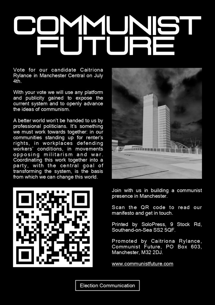 Over 60,000 leaflets, calling for a vote for Communist Future’s candidate Caitriona Rylance, will be dropping through letterboxes across central Manchester.